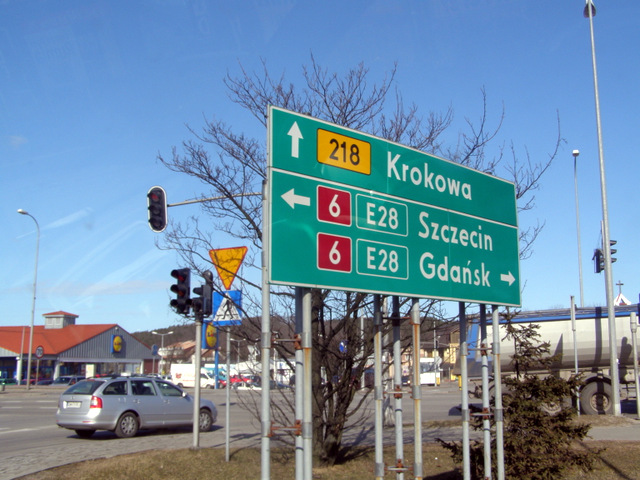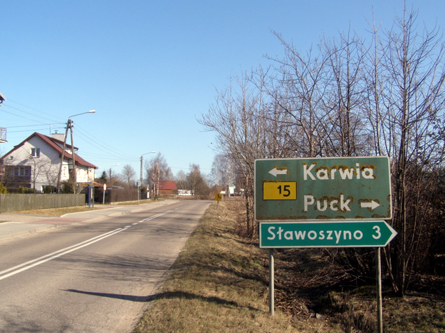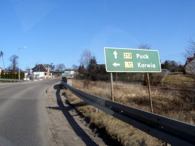 Dojeżdżamy do ronda w Krokowej. Stąd wybierając 3 zjazd, czyli w lewo możemy dojechać do Dębek - 7km lub Białogóry - 17 km. My wybieramy 1 zjazd, kierunek : Karwia - 10 km , Jastrzębia Góra 15 km.